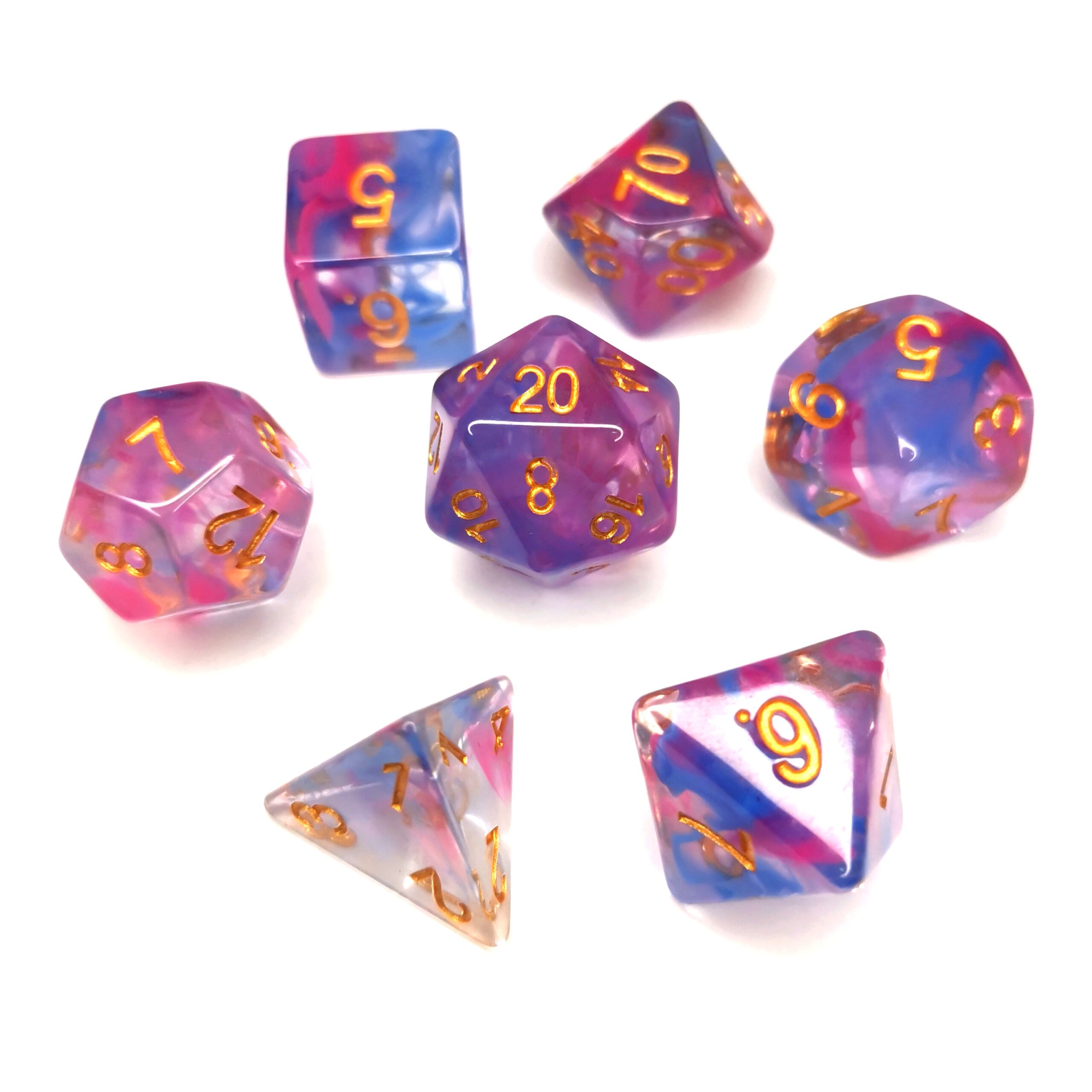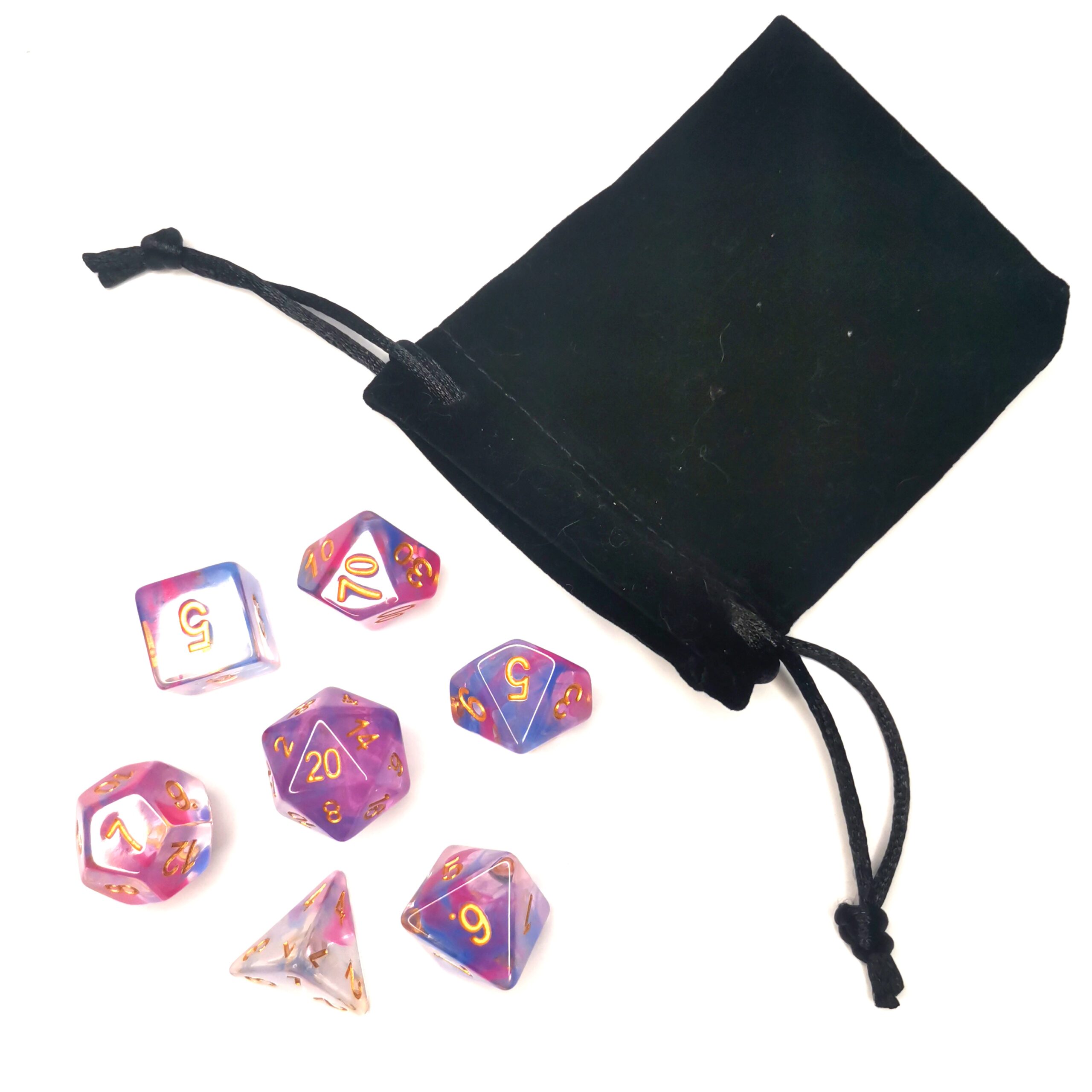 Dark Purple and Blue in Resin dice set. Our dice come with a velvet pouch to keep them safe.