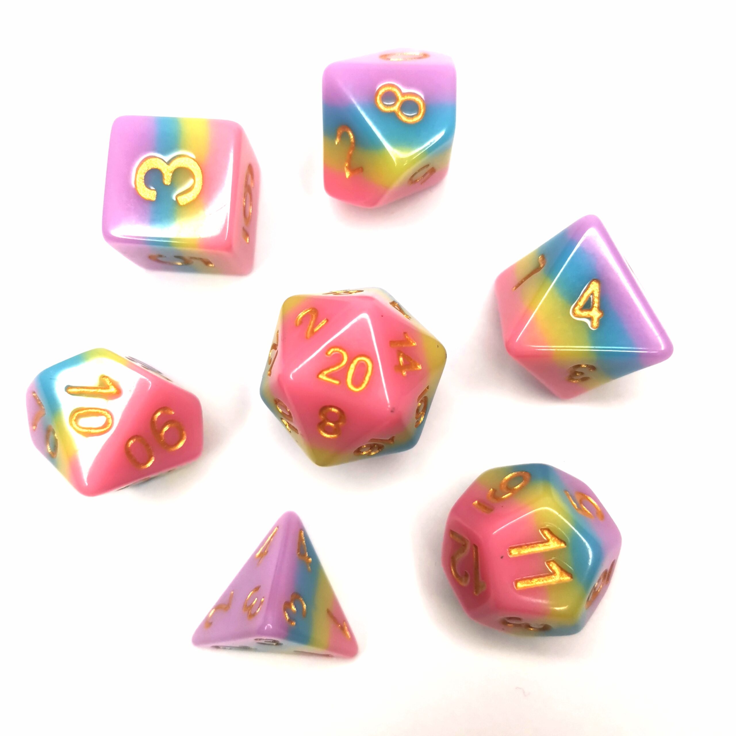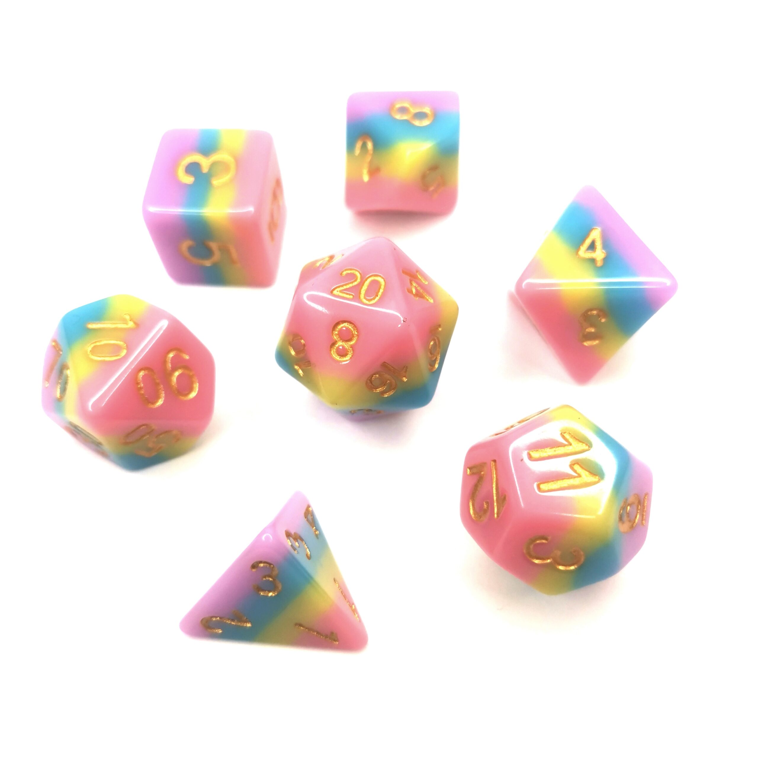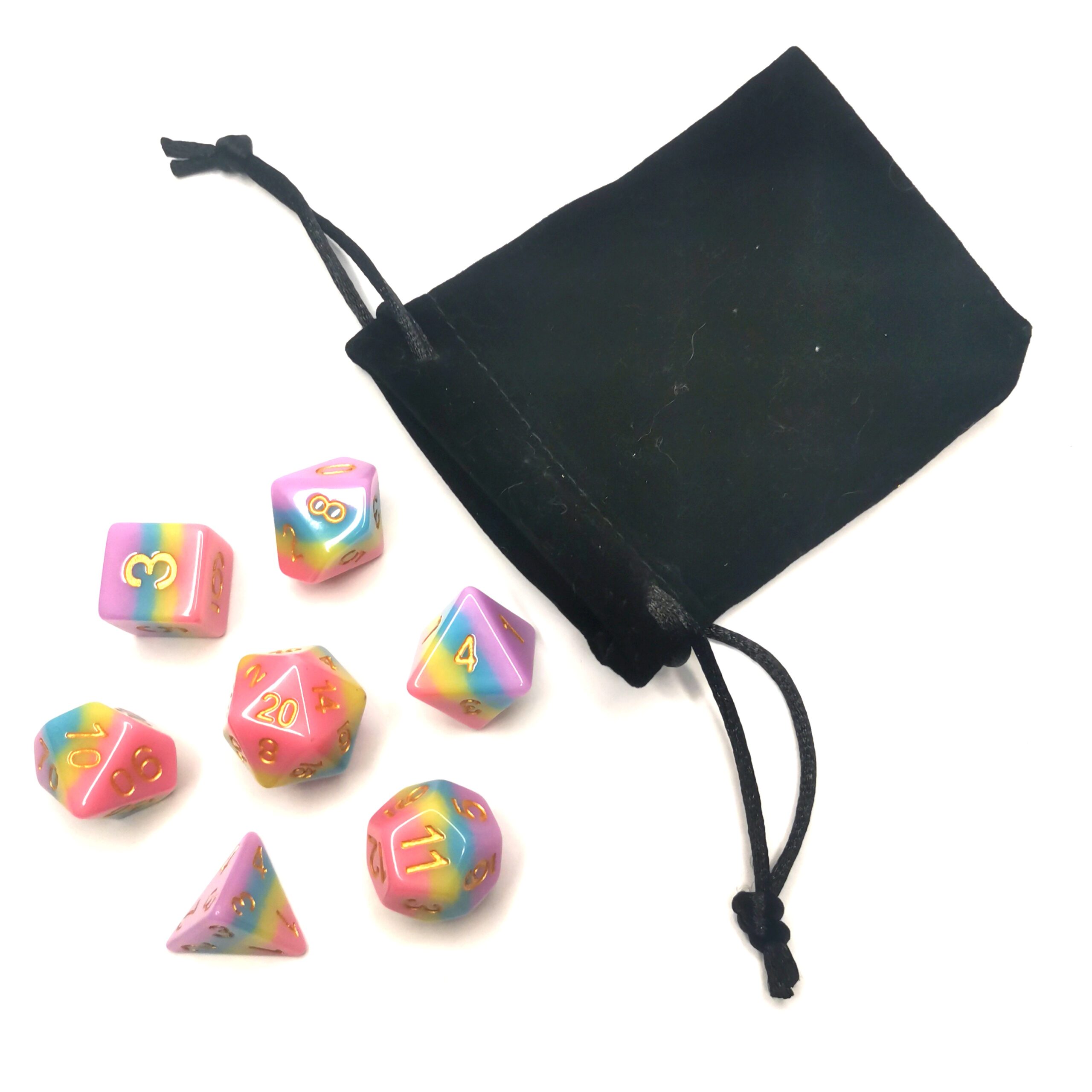 Pastel Rainbow layered Resin dice set. Our dice come with a velvet pouch to keep them safe.